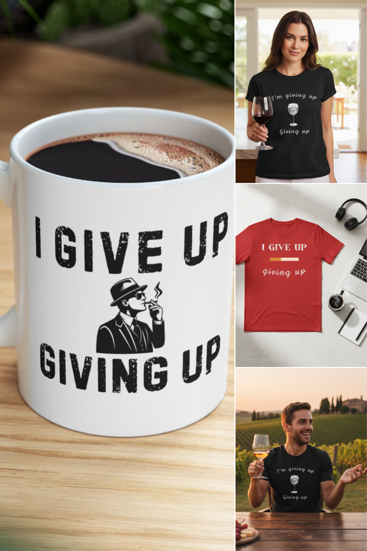 Let's face it - most New Year's resolutions fail by February. Why not embrace reality with our hilarious "I Give Up Giving Up" collection? Perfect for anyone who's tired of setting unrealistic goals and ready to laugh about it.