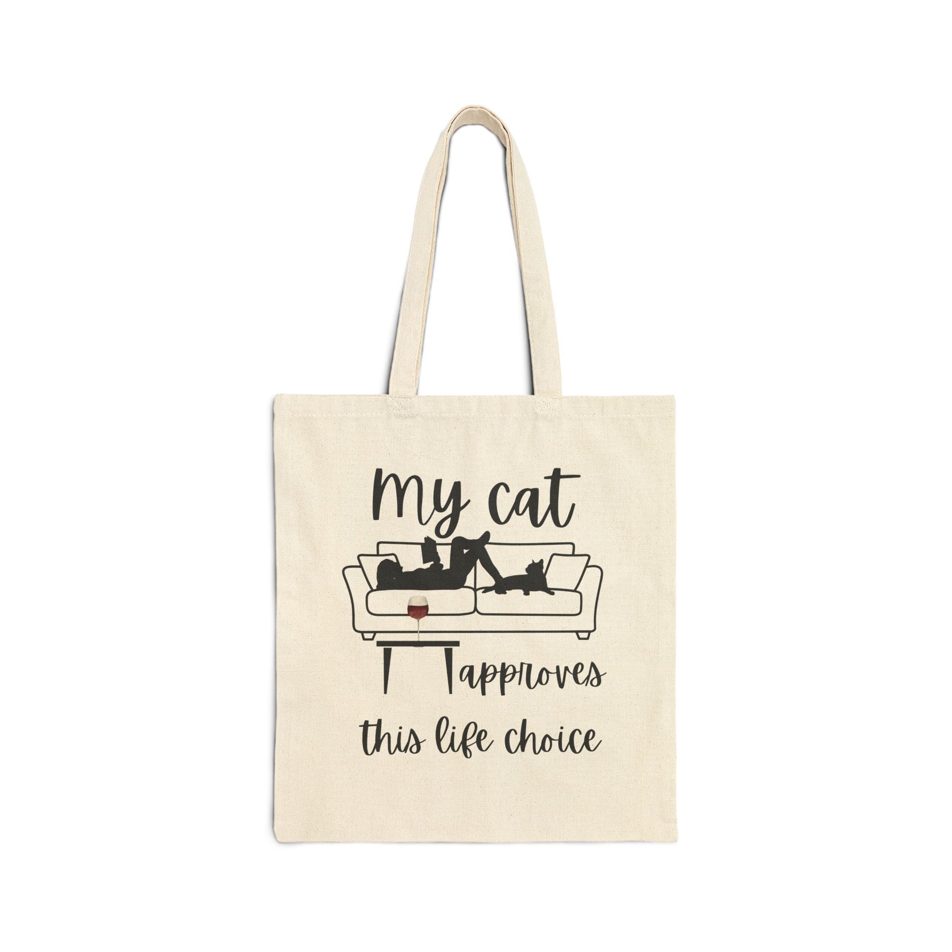 Cat, wine and book Lover Cotton Canvas Tote Bag – "My Cat Approves This Life Choice"