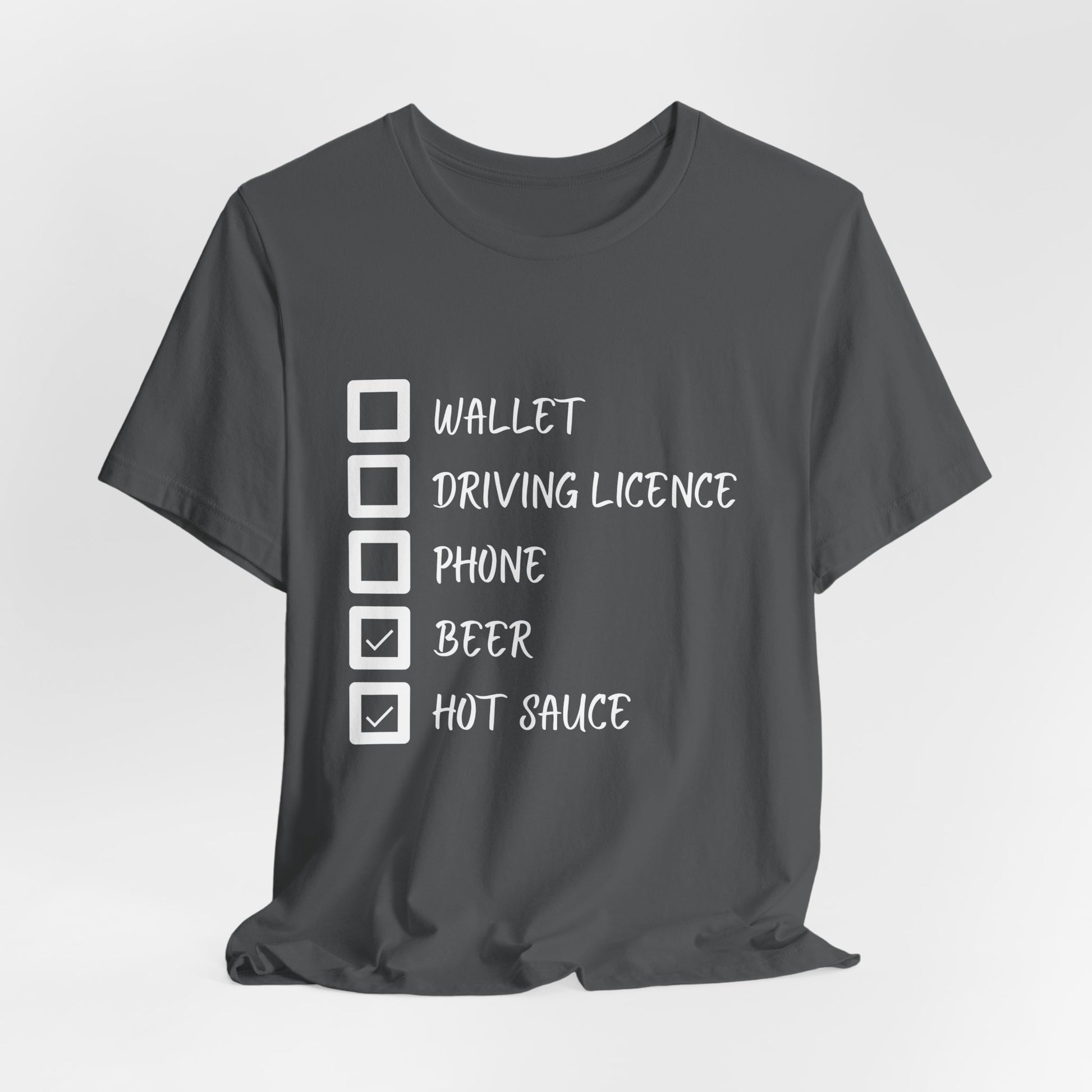 Manufactured in the USA, this cotton unisex t-shirt is the perfectly funny shirt for anyone who knows what really matters when heading out the door. Perfect for tailgates, BBQs, game day, or just living your best spice-loving, beer-drinking life.